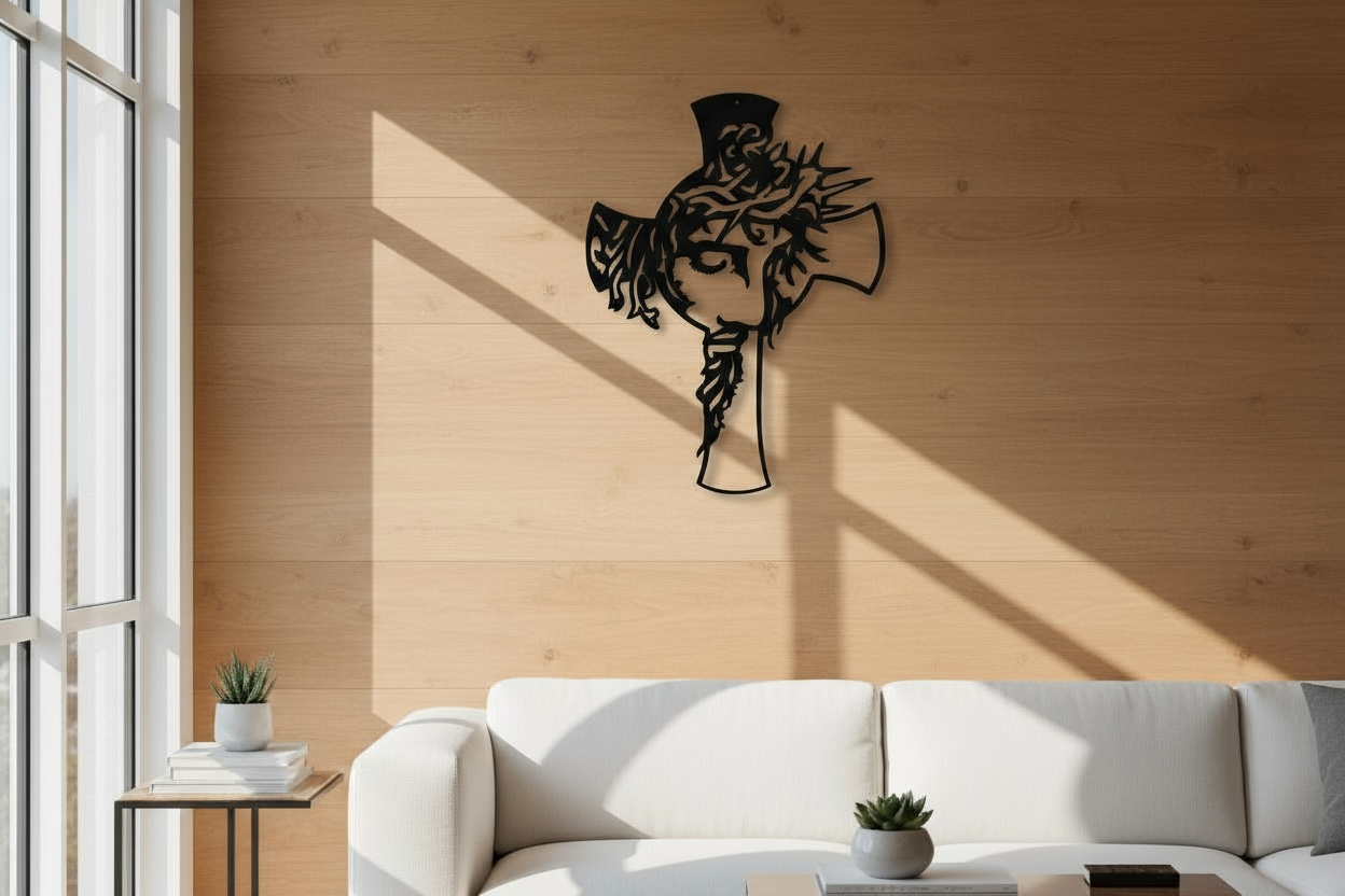 A cross featuring a precisely crafted metal silhouette of the face of Jesus Christ, our Savior. This stunning and intricately designed piece of metal artwork serves as a powerful symbol of faith and devotion.