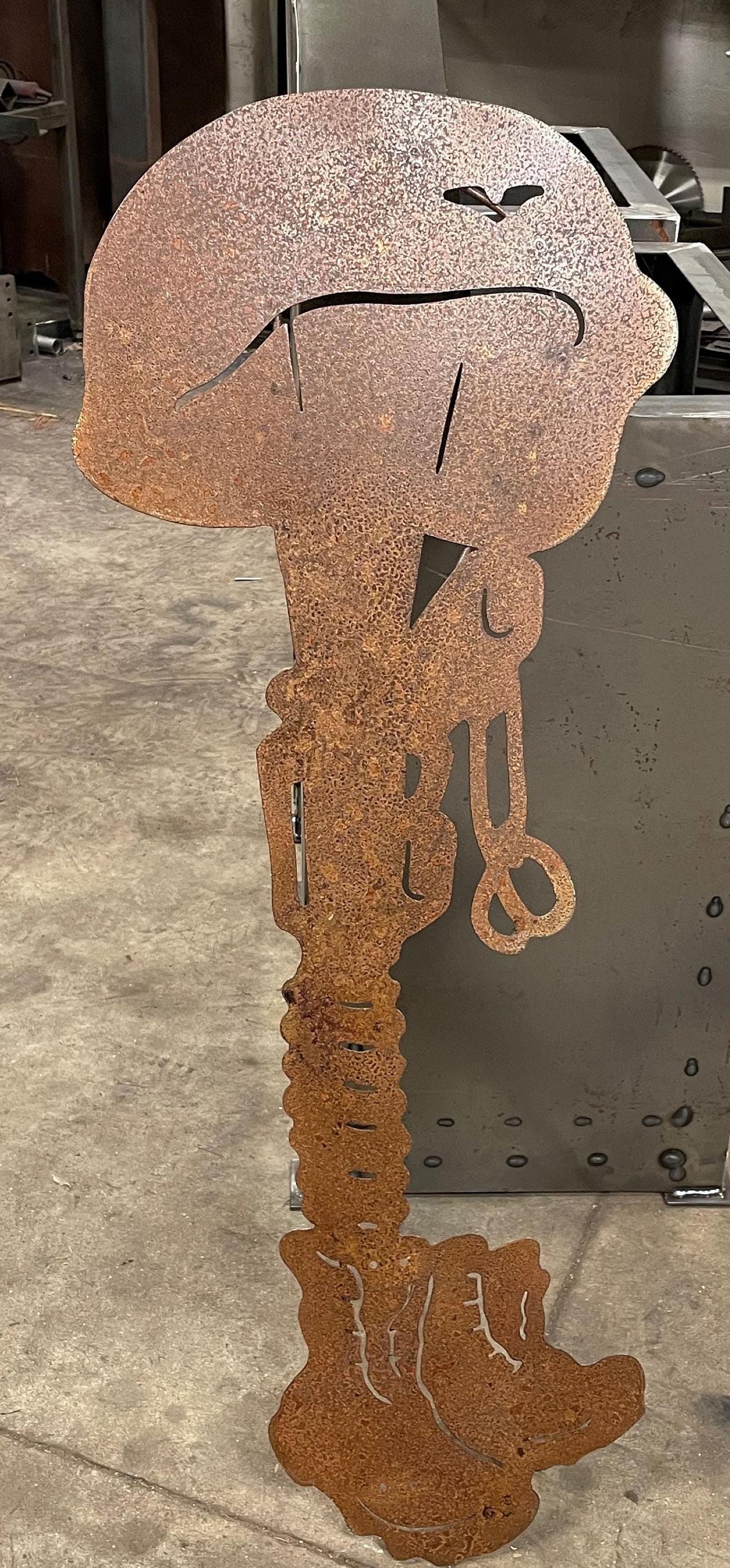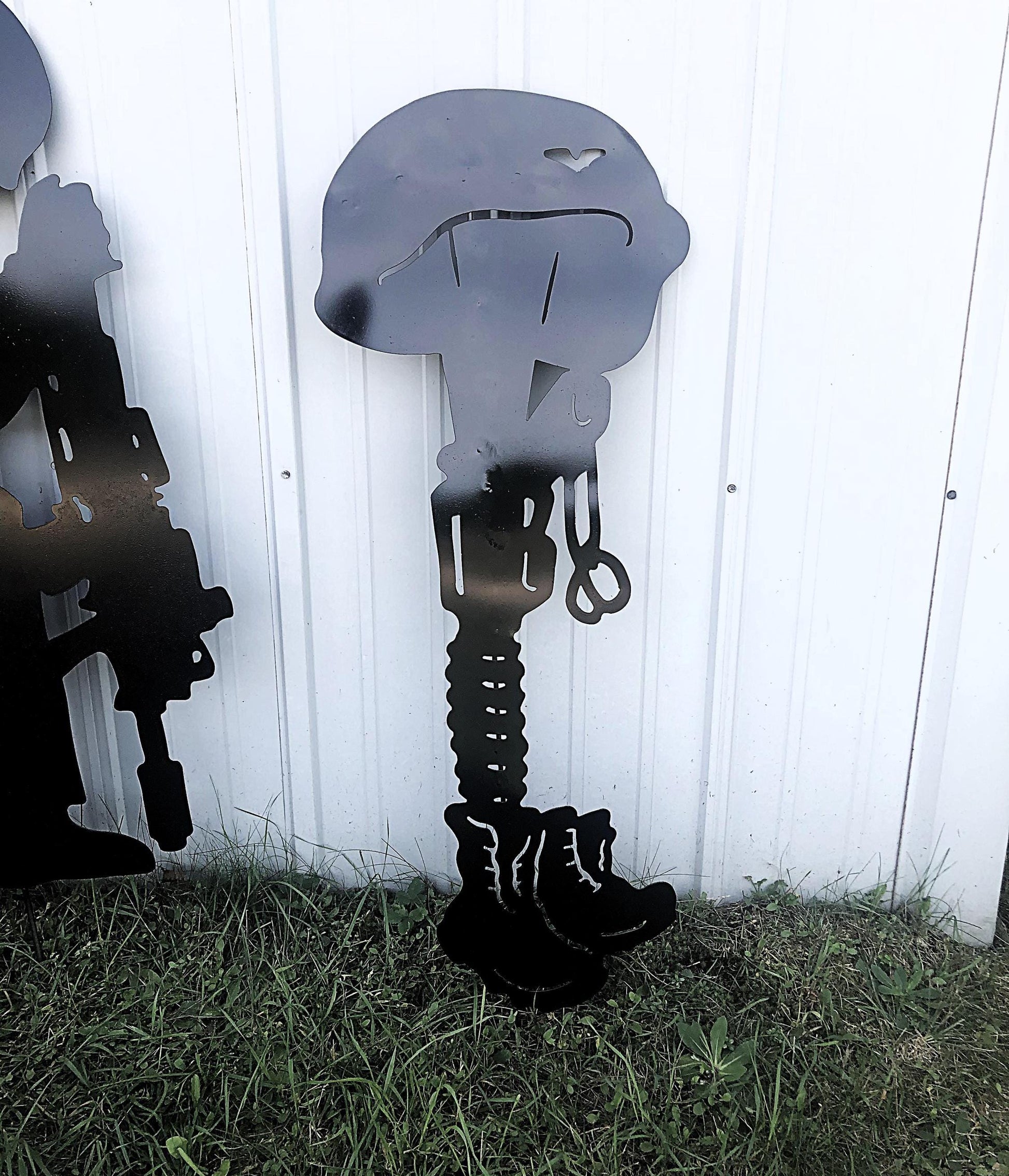 3' Tall Fallen Soldier Memorial Metal Silhouette with Helmet, Boots, Rifle, and Dog tags with ground stakes. Item is reinforced for strength and durability, but we suggest it lean up against a structure or tree for extra stability.